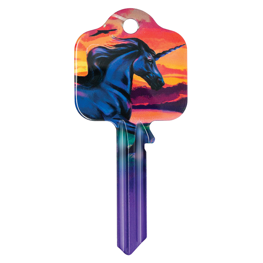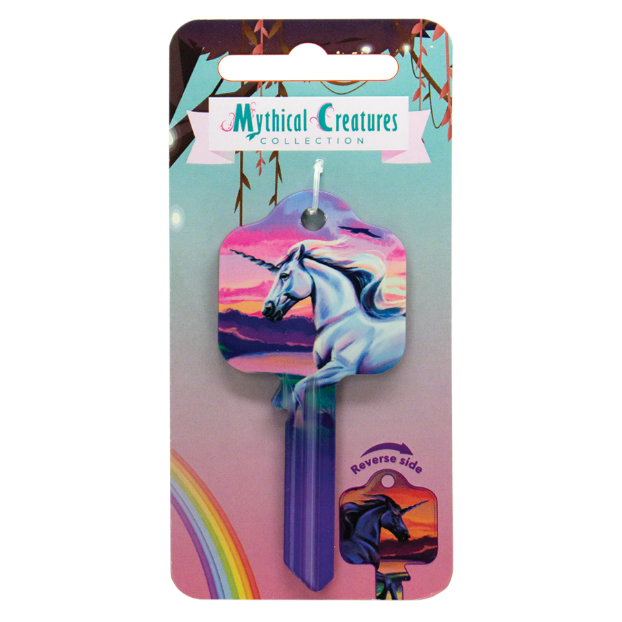 The White & Black Unicorns UL2 key blank has beautifully handrawn original illustrations of Unicorns, with a different design on the front and back.