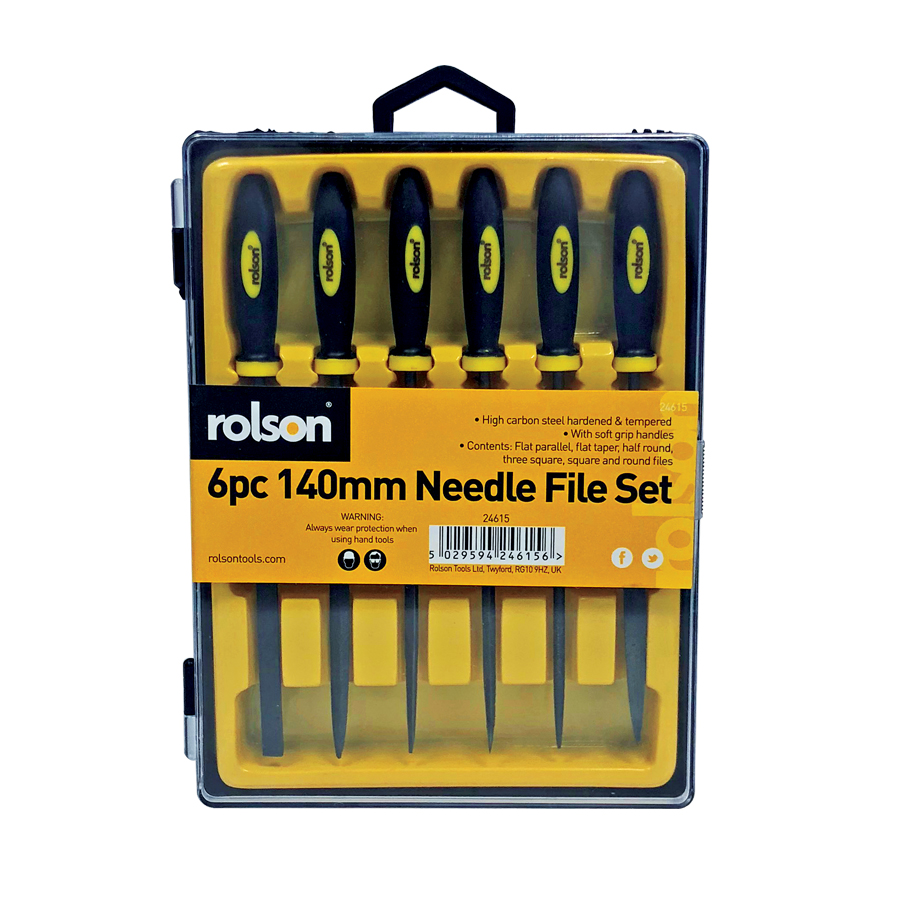High Carbon Steel hardened and tempered with soft grip handles. Contains flat parallel, flat taper, half round , three square, square and round files.