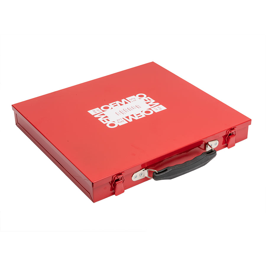 Compartments for tweezers, followers and springs. Steel carrying case with moulded plastic insert tray and numbered compartments.